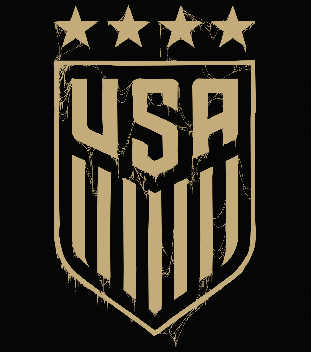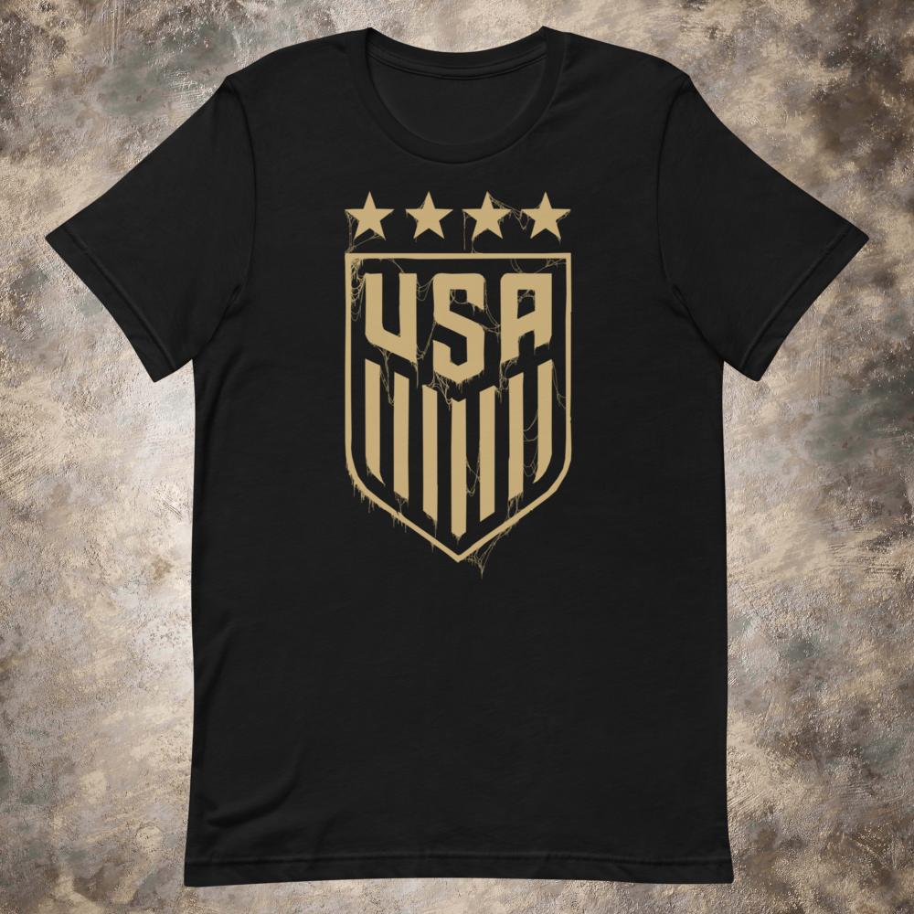 Black Metal Soccer, USA "Four Star Crypt" design printed direct to garment on a black, 100% cotton, Bella + Canvas 3001 unisex tee. Women's sizes on Bella + Canvas 6400 relaxed tee.
