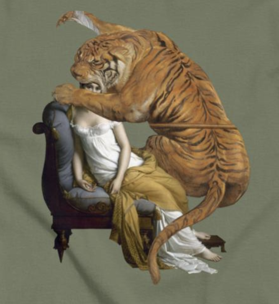 Hand-cut tiger collage printing on a 100% cotton military green tee.