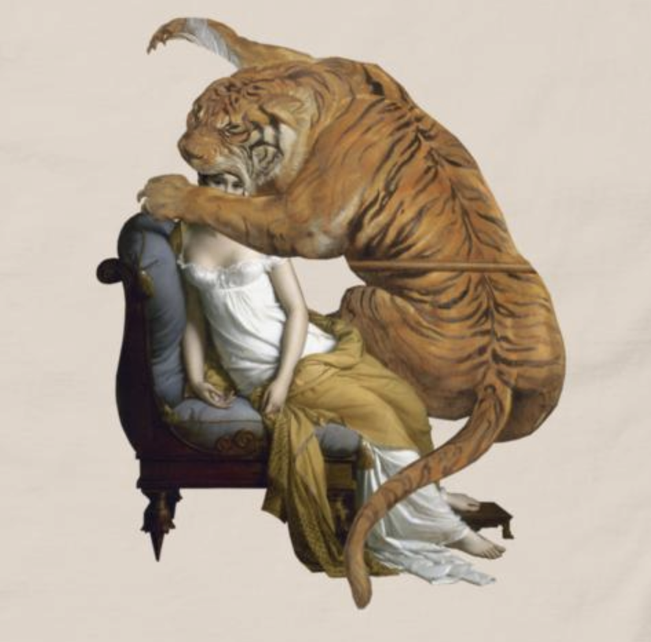 Handcut tiger collage printing on a 100% cotton natural white tee.
